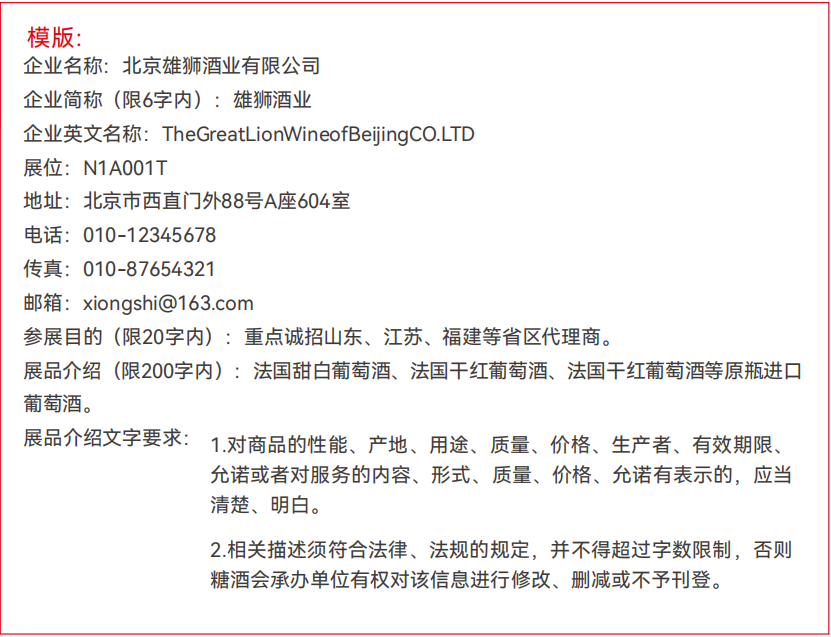 (02)办理《货车进馆证》流程如下 办证须知: 货运车辆办理《货车进馆证》需缴纳车辆秩序维护费:50元/车/次、押金300元/车/次,从打印证件开始,至卸货完毕的车辆随证到退证点退证时间止,每车享有150分钟的免费卸货时间,若超过150分钟每车按50元/30分钟缴纳超时违约金,费用从交纳的押金中扣除,不足30分钟按30分钟计。提示:此证严禁转借、转让,确保一车一证。 2、展品物流代理(食品机械展品代理收货转运除外) 国 内 物 流:南京国际博览中心 收 货 地 址:南京市建邺区江东中路300号南京国际博览中心1号馆物流仓库 收货联系人:孔祥旺198 2504 3538/1982504 3678 运输联系人:何涛18117885593/青阳18884391429 唛 头 标 识:请务必在展品外包装箱上张贴展品唛头!唛头需填写发货人、联系方式、参展单位名称、展馆号、展位号等相关信息。 3、食品机械展区转运服务单位 指定四川西南食品包装机械有限公司为本届糖酒会食品机械展区转运服务商,负责布撤展期间免费为食品机械展区所有参展单位统一提供在展区指定地点的样品上下车装卸和转运服务。收货单位:第113届全国糖酒商品交易会机械展区收货地址:南京国际博览中心12-13号机械馆收货人:金勇 电话:139 0821 7021 展品包装要求:坚固、防潮。发货、收货单位务必写全称。毛重、净重、起吊线字体要清楚,并标明重心位置。须写上“第113届全国糖酒商品交易会样品”字样,并注明展品“正面”字样和“展位号”,以便转运服务商将样品转运到指定展位。展品进馆时间:2025年10月10日 2025年10月10日之前运到南京的展品暂时库存到仓库(注:仓库由参展商自行联系,仓储费用自理),2025年10月10日方可运到南京国际博览中心12、13号食品机械馆:2025年10月10日以后运到(含零担和自运)的展品请直接运到南京国际博览中心12、13号食品机械馆。 3-4.参展单位信息刊登《会刊》服务 请于2025年9月30日前提交参展单位信息,以便免费在糖酒会《会刊》上刊登。提交方式(展位号务必填写准确): 登录全国糖酒会官方网站进入展商服务--参展商预登记通道,登录后点击“会刊信息”,按网页提示填写信息。