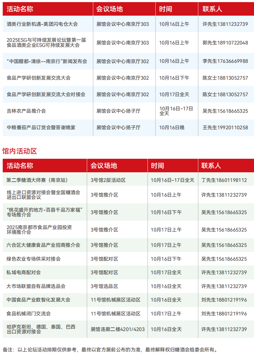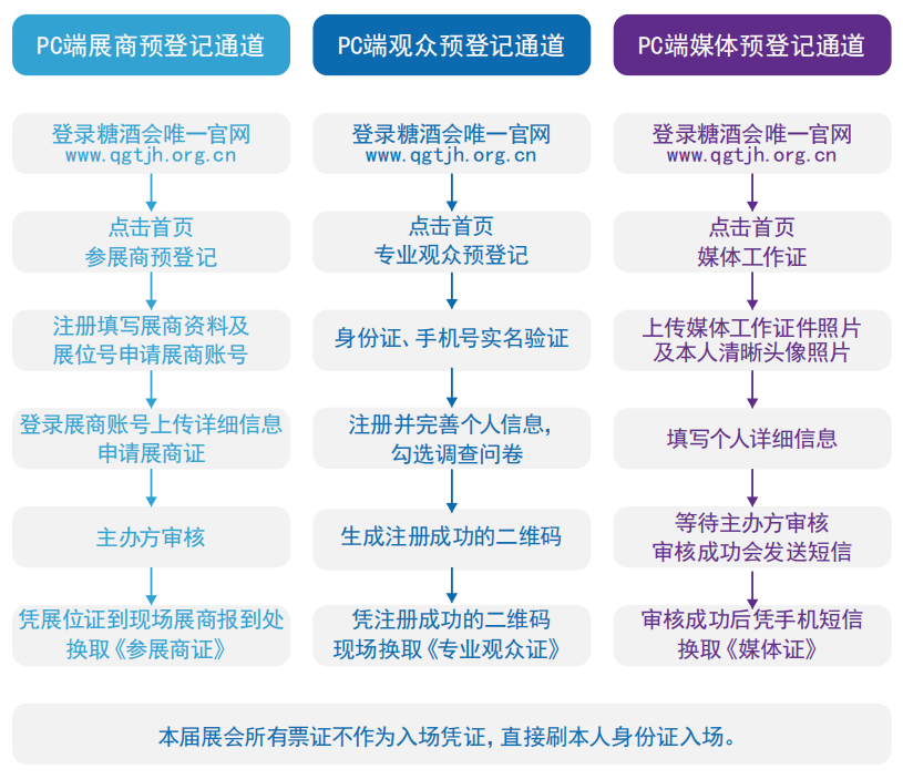 关于南京秋糖会参展单位信息录入《会刊》及备案搭建商管理的通知发表时间:2025-09-26 11:13 3-1.预登记服务 展商预登记、专业观众预登记及邀请 为给参展参会客商提供更好和更便捷的服务,全国糖酒会官方网站(www.qgtjh.org.cn)开通了“展商预登记通道”、“专业观众预登记通道”及“媒体预登记通道”,分别提供以下服务: ·展商预登记通道:展商信息登记、楣板信息提交、会刊信息提交、《参展商证》申请、邀请专业观众、协助专业观众登记 ·专业观众预登记通道:专业观众信息预登记、申请《专业观众证》(持身份证入场) ·媒体预登记通道:媒体人员信息登记,等待审核通过后,现场换取媒体证(持身份证入场)