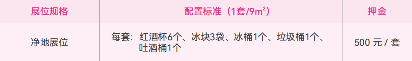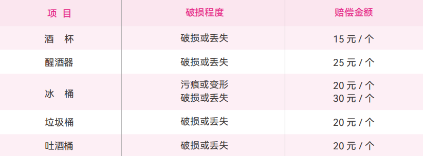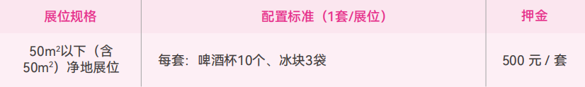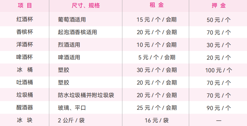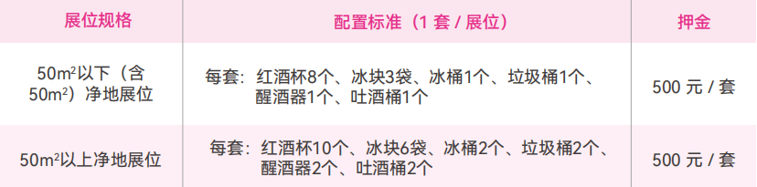 备注: A.国际葡萄酒及烈酒展区净地展位和标准展位均按上述标准分别免费配置酒具等相关物品,使用单位应按上述标准缴纳押金: B.免费提供上述标准配置内的酒杯清洗更换服务; C.1套垃圾桶包含1个垃圾桶和10个垃圾袋; D.若参展单位无物品配置需求,则***不予配置,也无须缴纳押金: E.配置服务为期三天(即2025年10月16日-18日) (2)配置物品赔偿标准