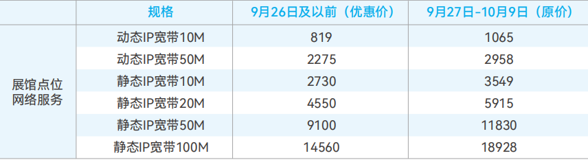 10月9日(含)前申报完成并缴费,按以上价格执行。10月10日至开展前申报,在上述价格基础上加收50%加急费。注意:10月10及以后申报网络,不保证完全提供。