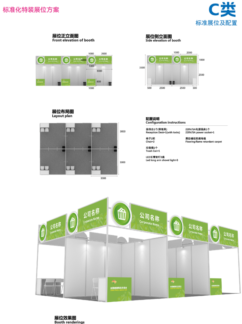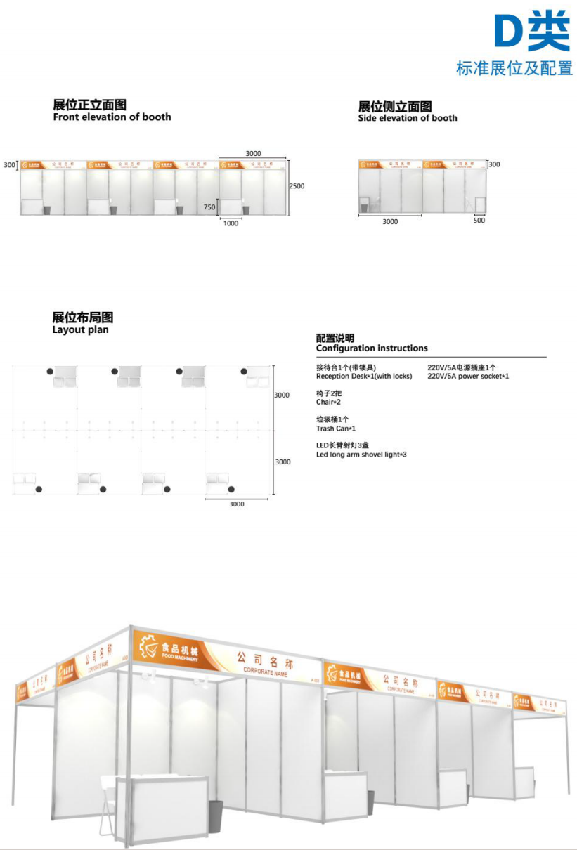 1.布展期规定时间外施工搭建视为加班,清场后需凭加班凭证再次进场施工。布展期间申请当日22:00前加班,请于当日16:00前按标准办理加班手续:申请22:00后加班,请于当日21:00前按标准办理加班手续,缴纳加班费; 2.加班申请以每个特装展位为申报单位,每个特装展位的展位面积不得拆零申报加班: 3.加班起始时间为加班不足1小时按1小时计算,以此类推; 4.净地展位提前进场须征得***及主场服务商书面同意,并在展馆与***交接场馆完毕后方能进场。 5.灭火器按2具/50m?配备,50m以下按50m?计算,50m以上按实际面积计算,每增加50m增加2具阻燃剂按1kg/10m计算,玻璃及木板地台无需申请此项;6. 7.净地施工保证金已包括灭火器保证金,不再单独收取: 8.展会结束后,若未退灭火器则按100元/具的标准扣除净地施工保证金。 9.布撤展证申请,每5m?不能超过1张。 10.上述礼仪模特价为起步价,翻译价为英文翻译价。 注意:10月15日17:00将闭馆实施消防安全检查,不予办理加班。收费明细表中的项目下单后概不退换。 4-4.标准展位配置及说明 (1)净地展位配置:除国际葡萄酒及烈酒展区(包括国家或地区展团)的净地展位有酒具等物品配置服务外,其余展区净地展位均无任何配置。 (2)C、D类标准展位配置:(所有效果图仅供参考,以最终现场实物为准)备注:标准展位配备用电仅供小电器使用,功率不得超过300w,如需使用大功率用电请额外申请。